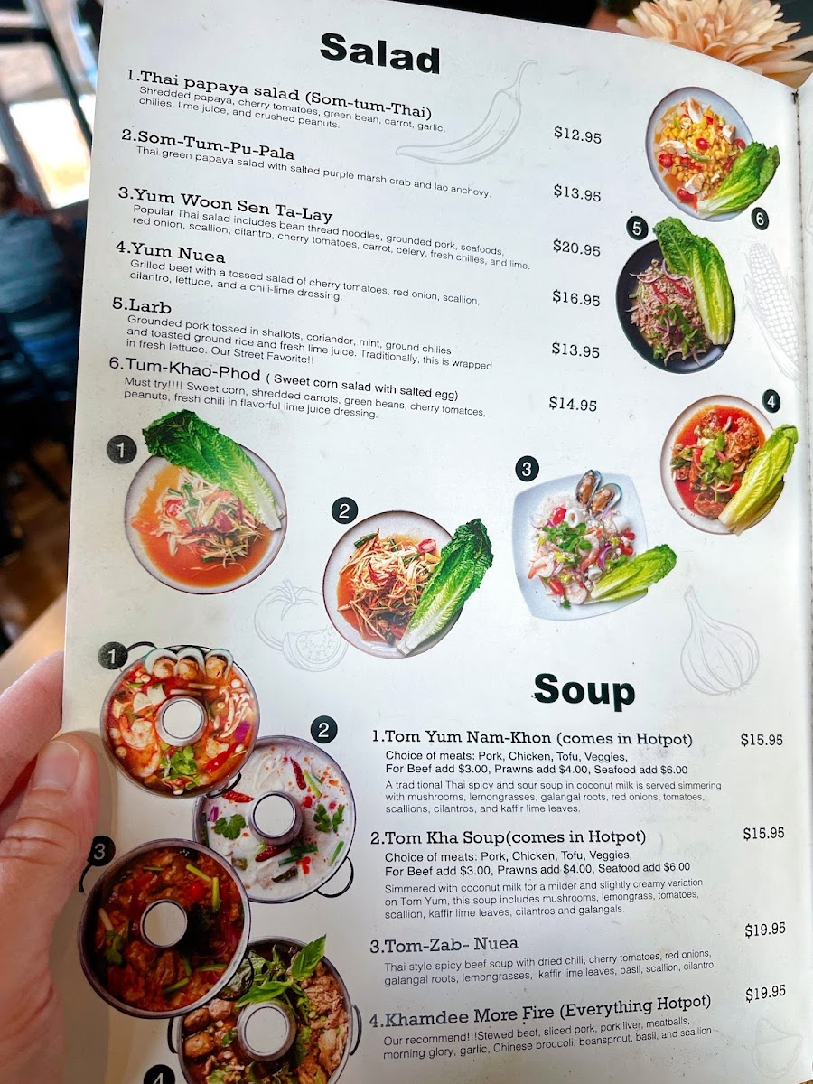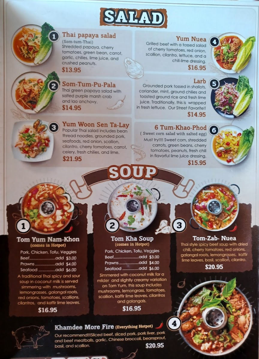 But the culinary experience at Khamdee truly shines with their soul-warming soups and hearty hotpots. The Tom Yum NamKhon, a traditional Thai spicy and sour soup, is a revelation, arriving at your table bubbling in a hotpot, filled with your choice of meat or tofu,鲜美的蘑菇,和新鲜草药. The signature dish, Khamdee More Fire, is an absolute must for spice lovers; packed with an enticing mix of sliced meats and robust flavors, it’s guaranteed to ignite your taste buds and keep you coming back for more.